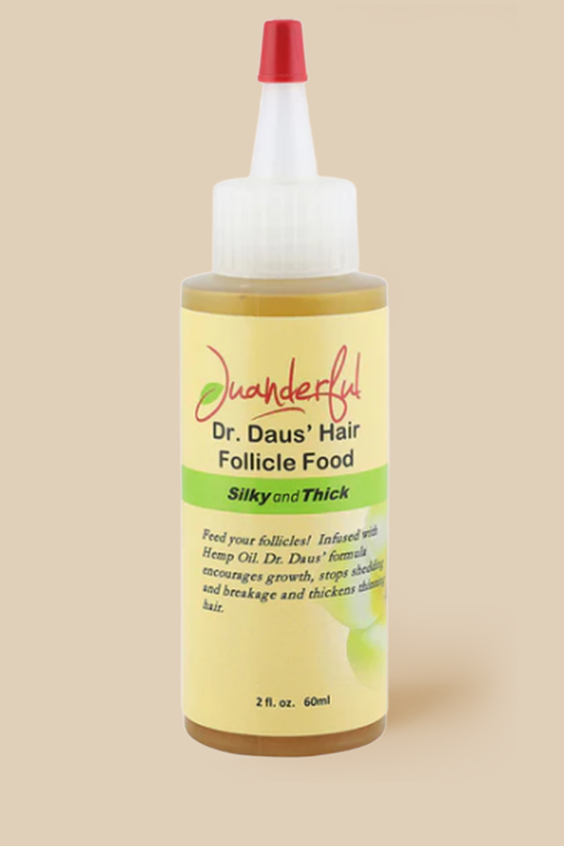 The average person loses between 60-100 hairs a day. Dr. Daus' Hair Follicle Food is infused with Hemp Oil and a formula that encourages growth, stops shedding, breakage and thickens thinning hair and packed with Omega-3, Omega-6 and Omega-9 fatty acids, which are necessary in stimulating growth.